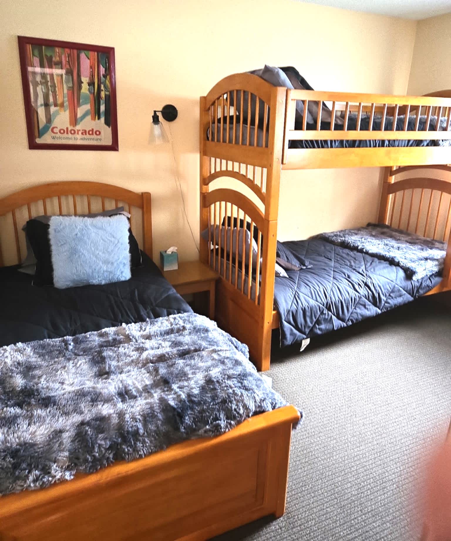 You want to bring your whole family to Jiminy and be in ONE CONDO, with gorgeous views, a deck, BBQ, Backyard, and be at Jiminy Peak - This condo is for you - right in the heart of Country Village. This Stylish 2BR, 2BA country Condo is fully updated, and has all the accesses of jiminy Peak without the bustle. Nothing better. It also comes with its own private parking in front of the condo and you have full access to the amenities of the Country Inn (The inn with Fitness, pool, hot tub, etc). This large 900 sq ft condo features country decor, & sleeps up to 7 with a queen, two bunk beds , a twin bed, and a pull out queen sofa. You will LOVE Jiminy any season!