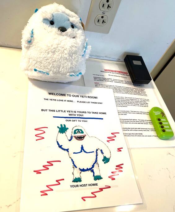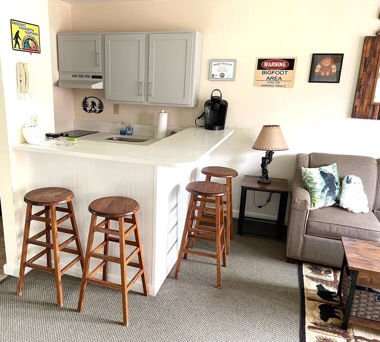 You want to pop out of bed, walk outside, and be right on the mountain This 1BR 1 BA Ground Floor Unit Charming Mountain Yeti Decorated Suite right by the entrance features a king bed in the master bedroom, plus a fold out queen sofa bed in the living room. The kitchen comes complete with all your needs, incl Keurig, pots, pans, etc. The unit is equipped with board games , along with cable TVs that have all your favorite shows . The Inn amenities are yours including heated year round pool